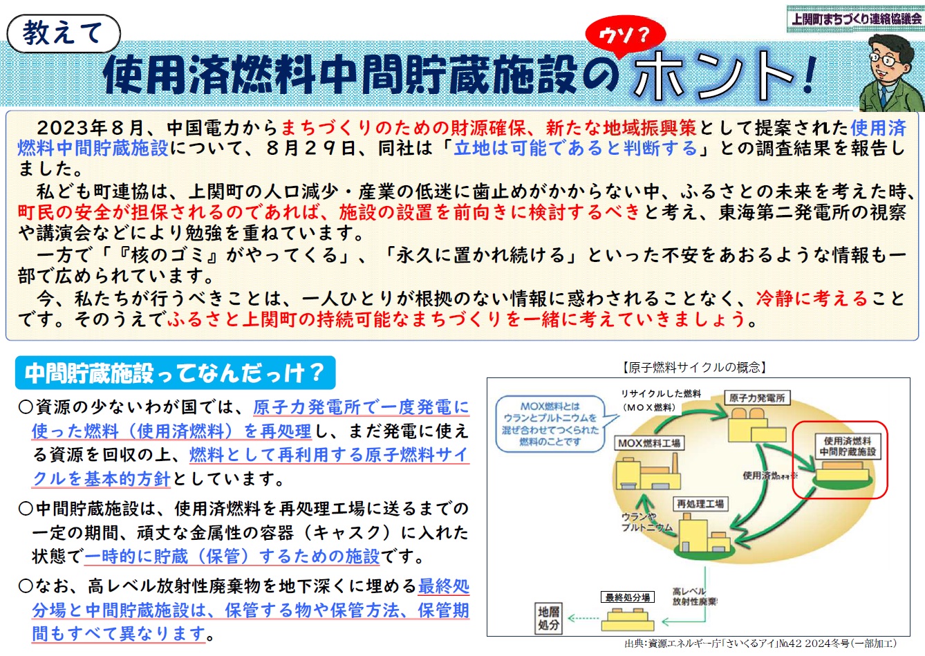 町連協ではこのたび、上関町内で検討されている使用済燃料中間貯蔵施設の理解促進のためのチラシを作成し、町内に配布しました。
